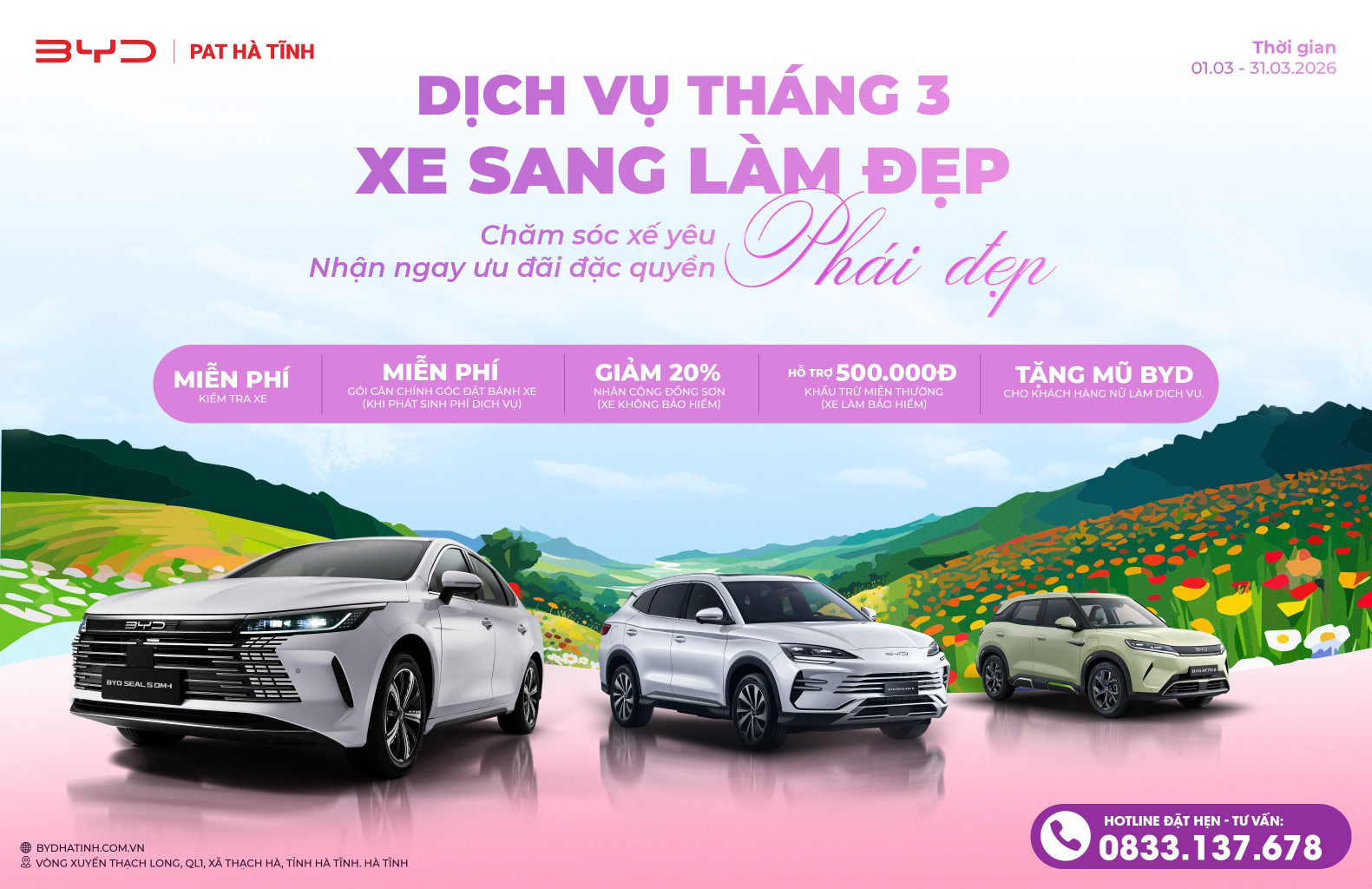Chương trình Dịch vụ Tháng 3: "Xe Sang Làm Đẹp - Đặc Quyền Phái Đẹp" tại BYD PAT Hà Tĩnh